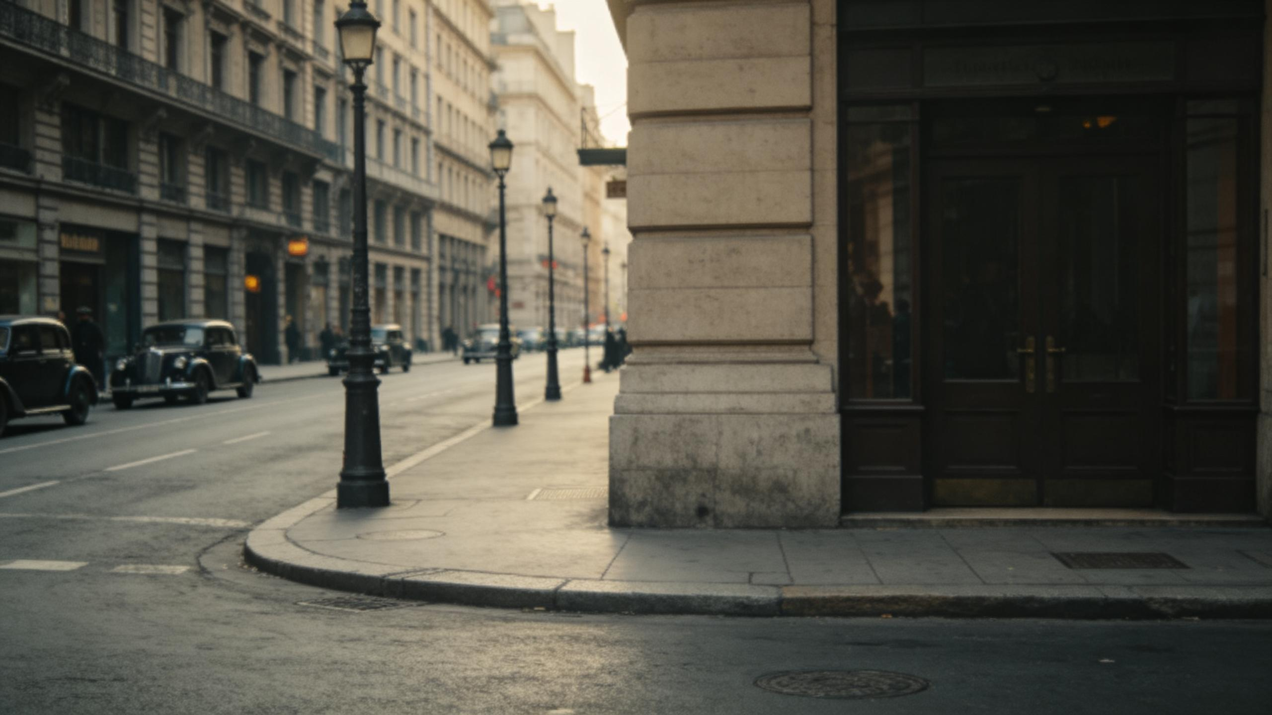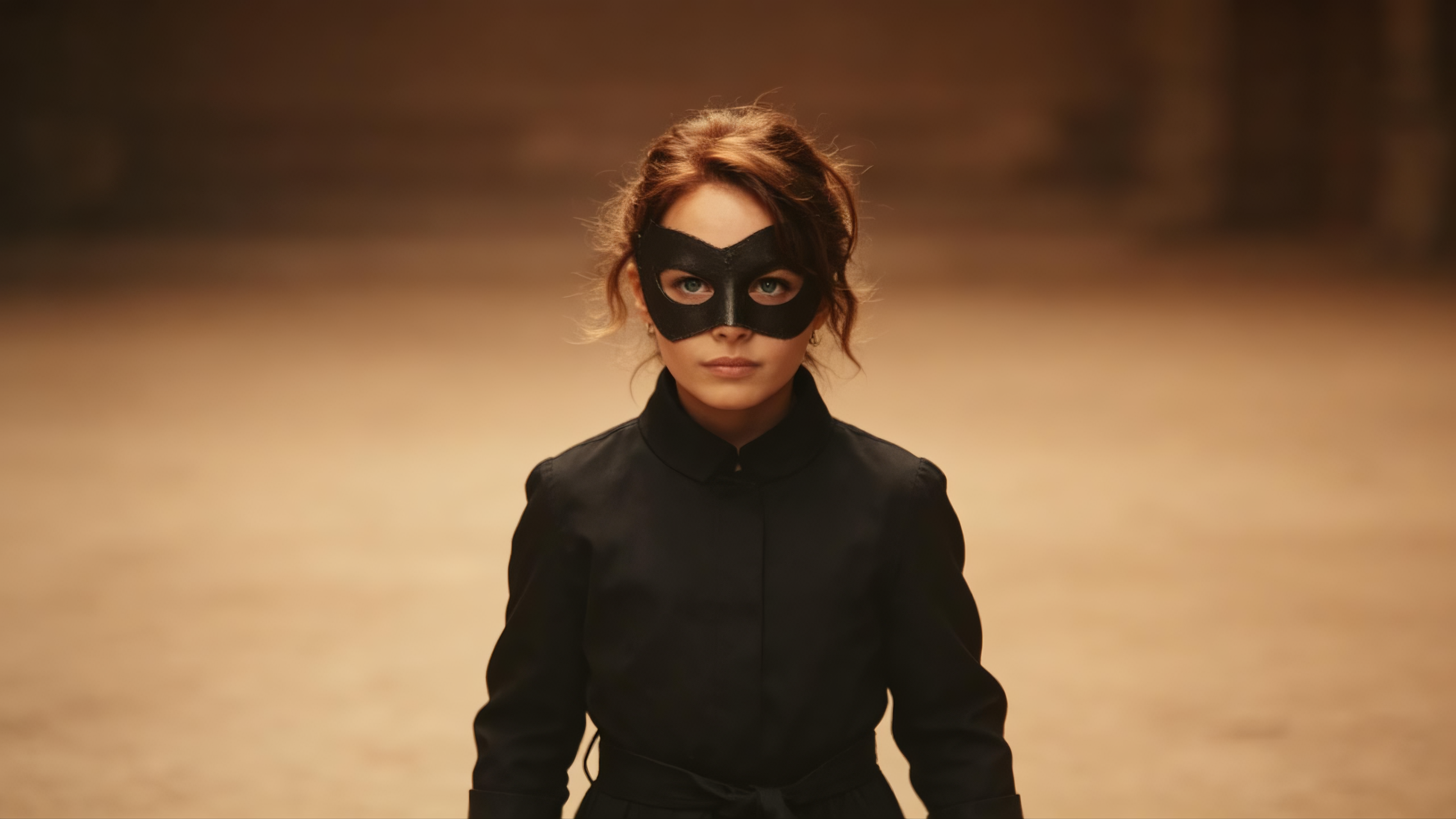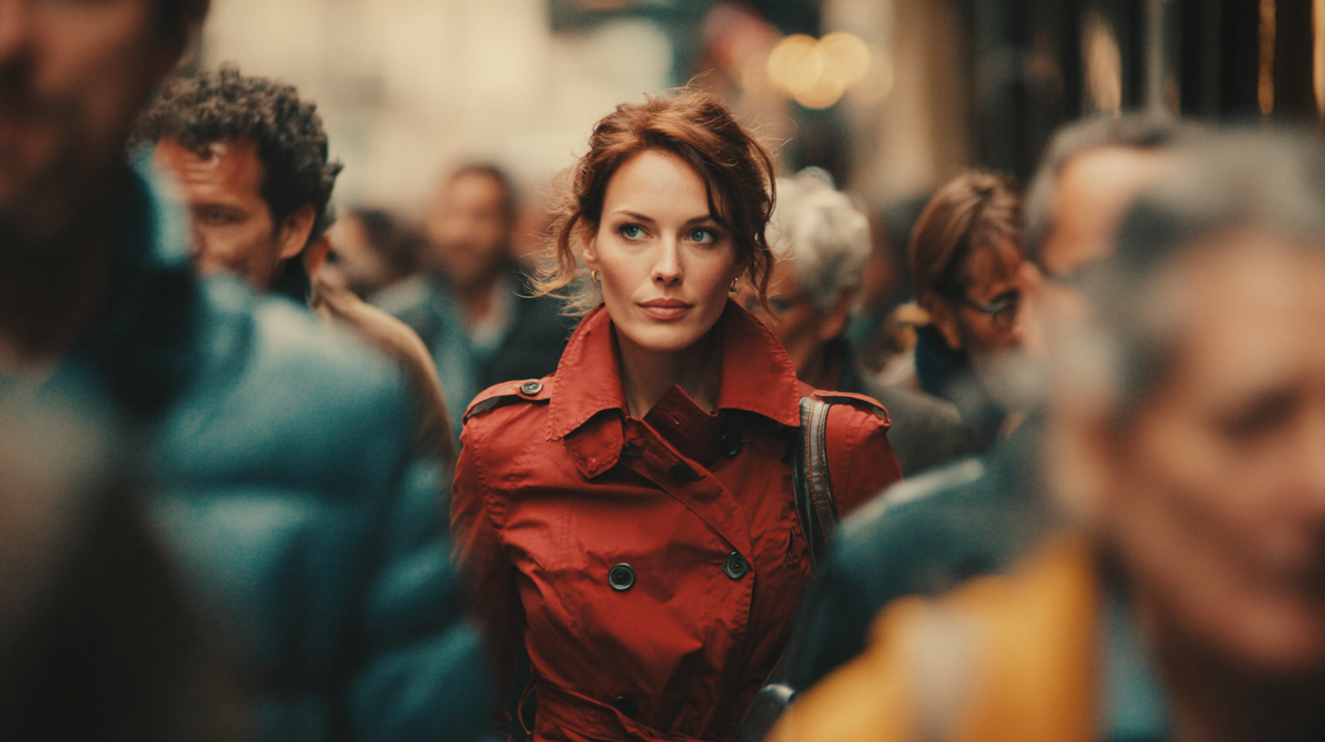Spy-thriller style. Use @Image1 as the first frame. Front-facing follow shot of a female agent in a red trench coat walking forward; stay in a wide follow shot as passers-by repeatedly occlude her. She reaches a corner; reference the corner architecture in @Image2. The camera locks off as the red-coated woman exits frame and disappears around the corner. A masked girl hides at the corner and glares at her; reference only the look of the masked girl from @Image3 as she stands there. Pan forward to the red-coated agent; she enters a mansion and disappears inside. Reference the mansion from @Image4. No cuts—single take throughout.