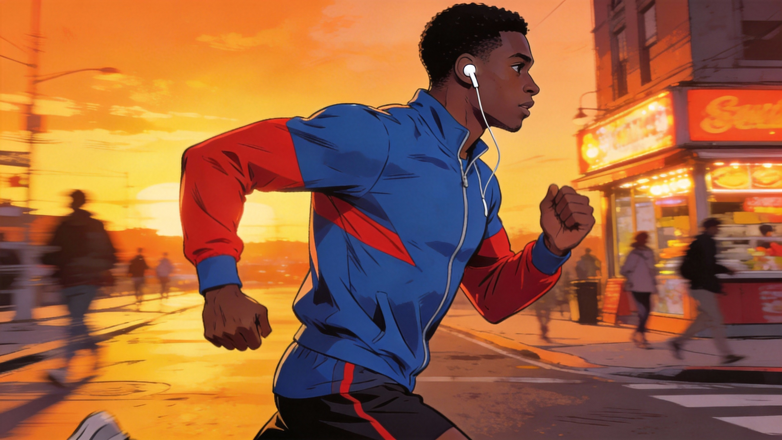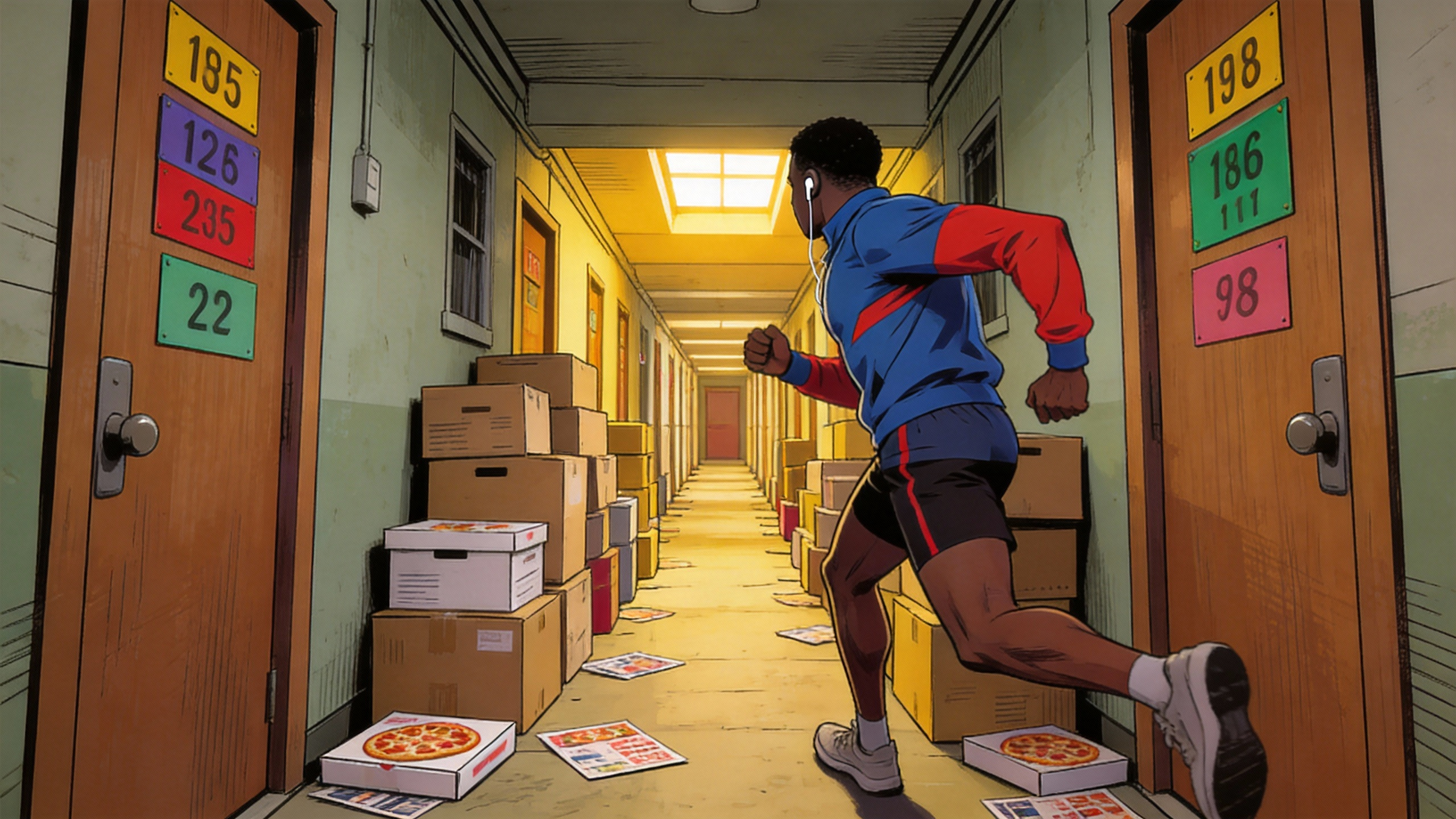 @Image1 @Image2 @Image3 @Image4 @Image5. A single-take tracking shot: follow a runner from the street, up the stairs, through corridors, onto the rooftop, ending with an overhead view looking down at the city.