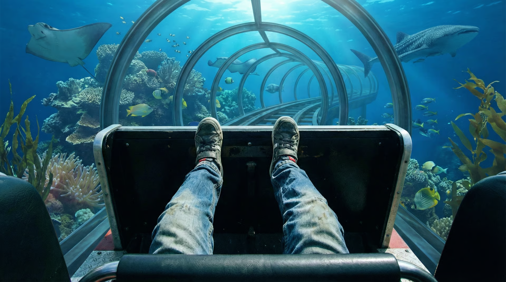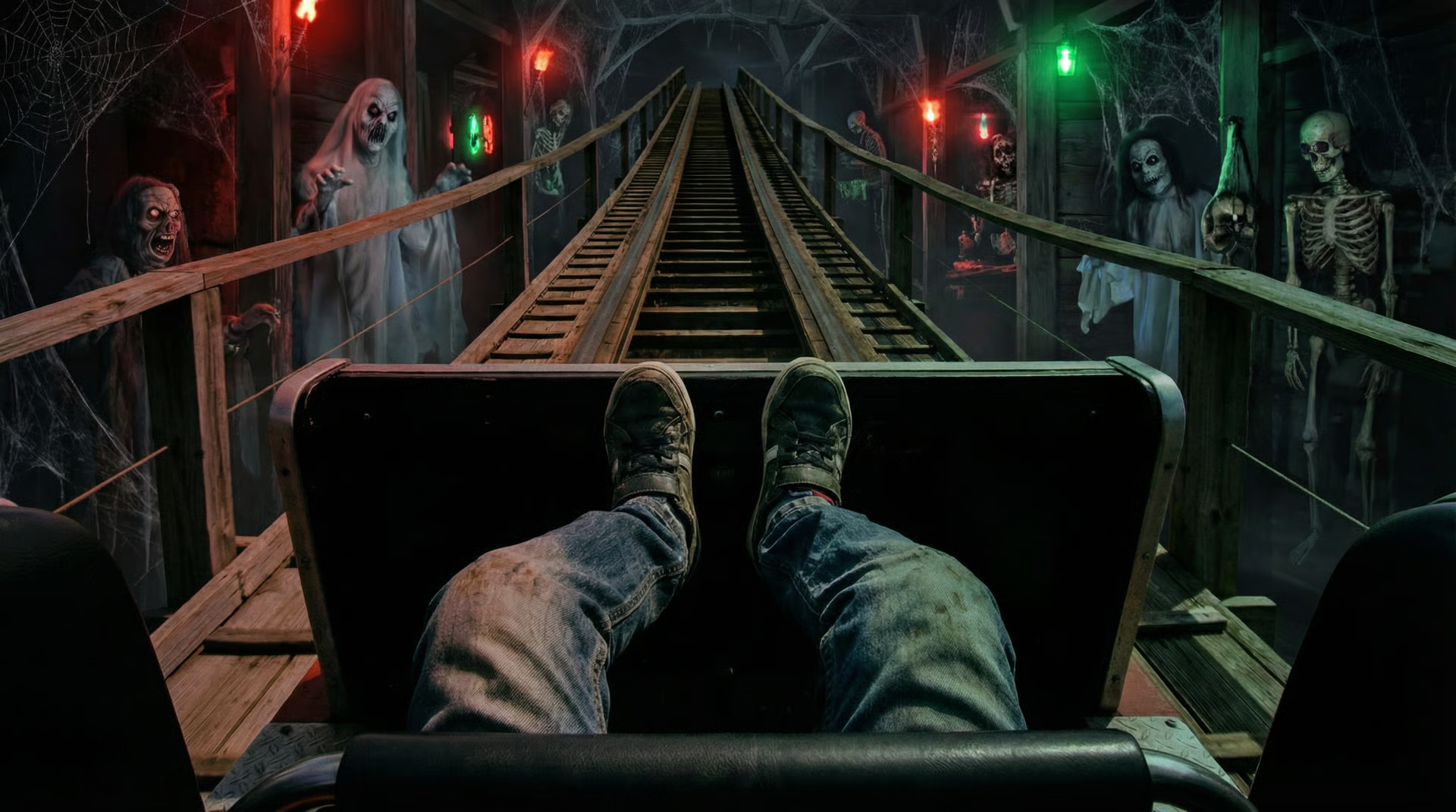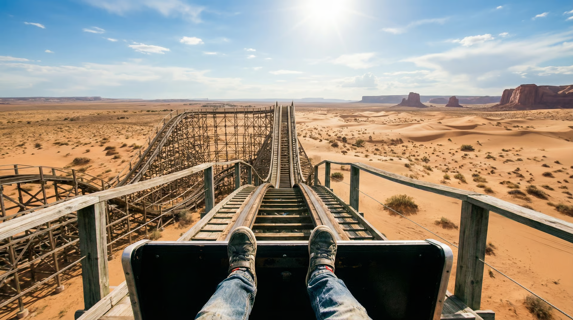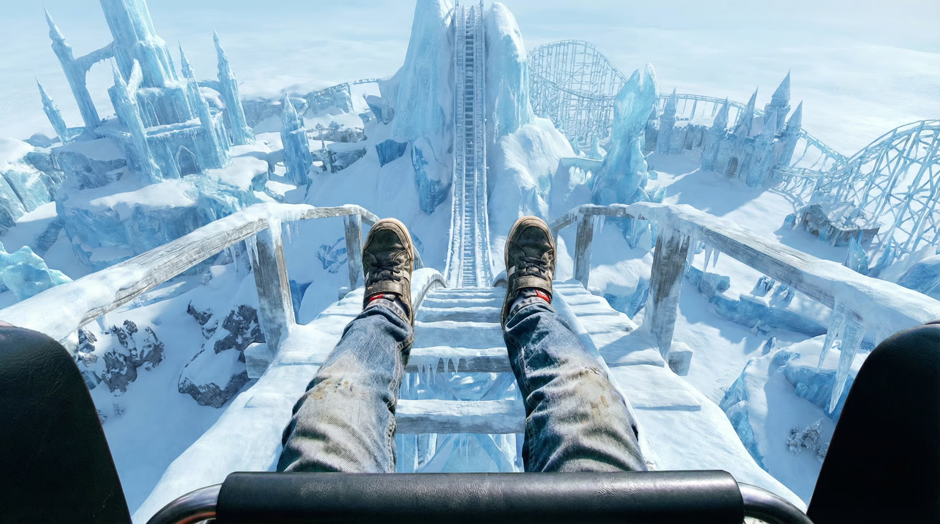 @Image1 @Image2 @Image3 @Image4 @Image5. Create a thrilling first-person, single-take roller-coaster shot. The roller coaster accelerates faster and faster.