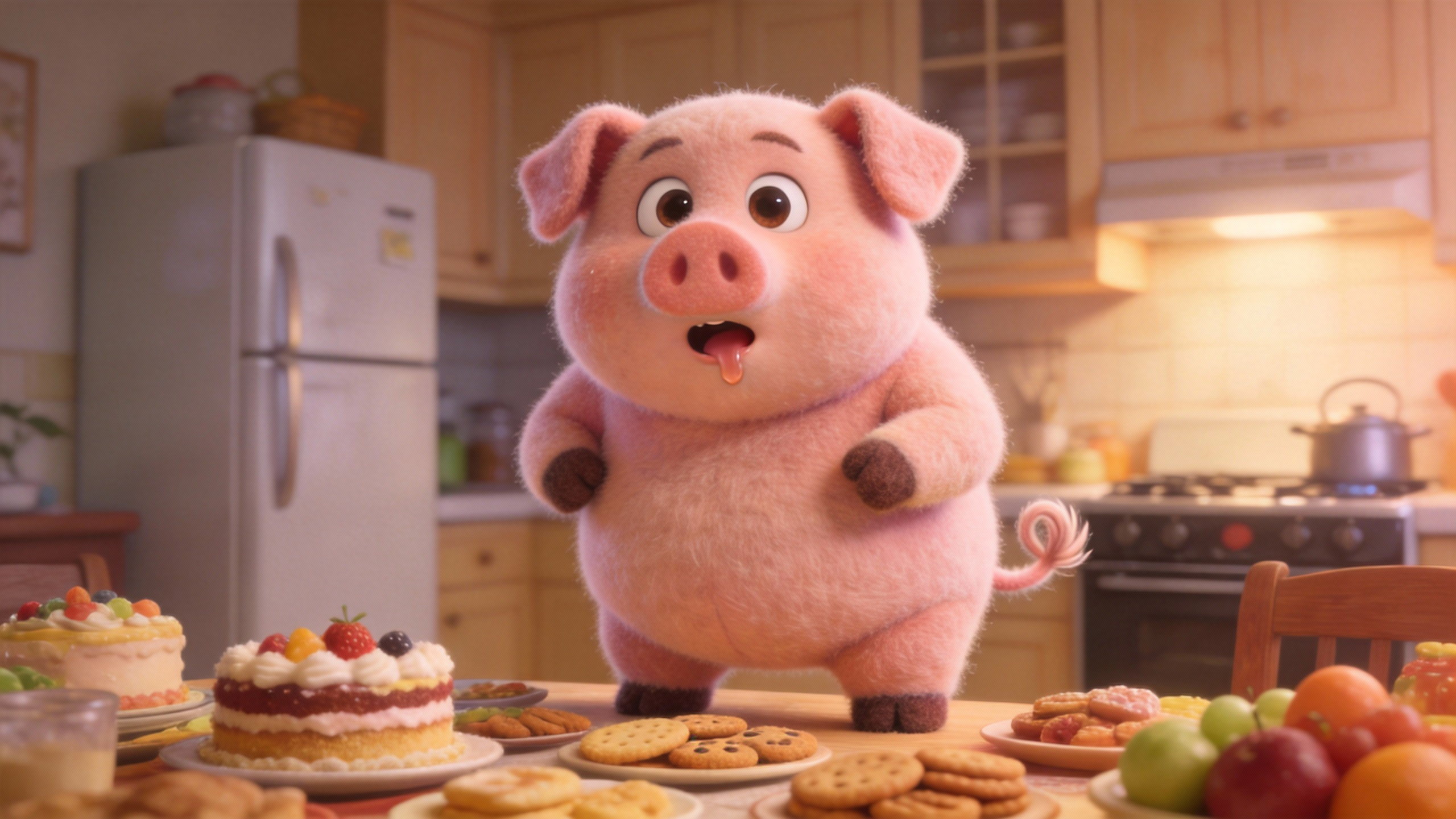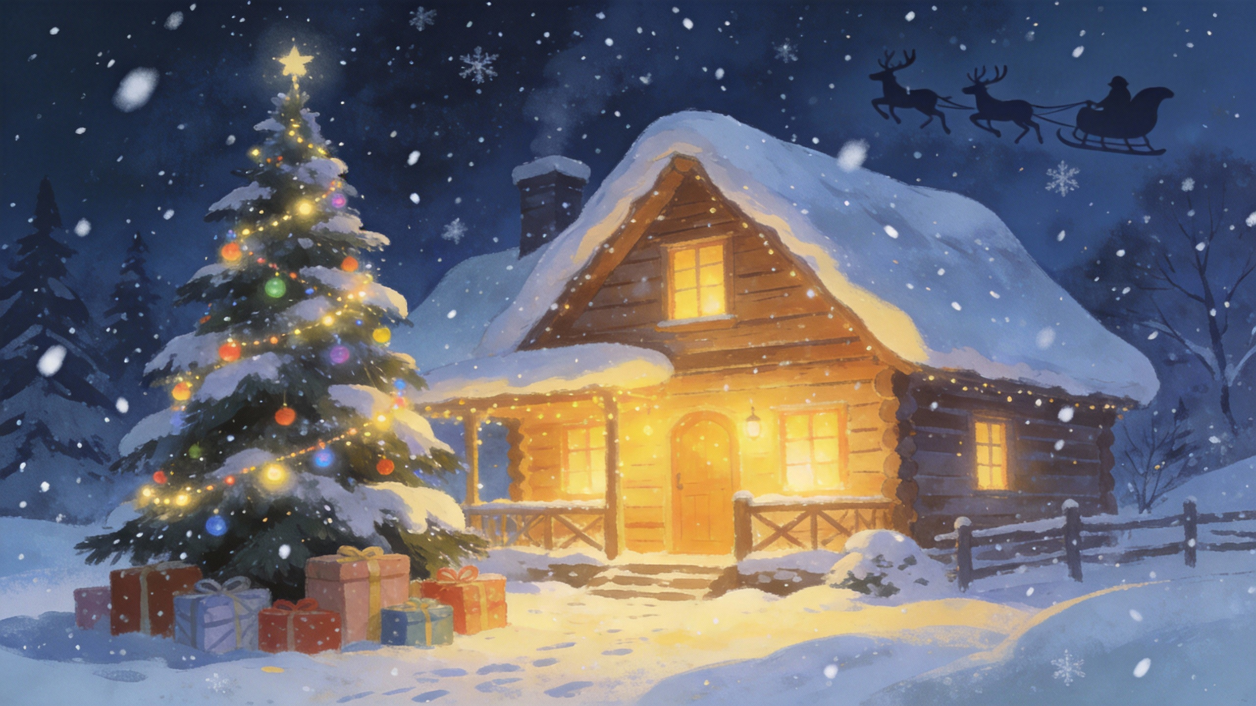 Based on the exterior shot in @Image1, do a fast push-in from a first-person POV into a close environment shot inside a wooden cabin. A little deer from @Image2 and a sheep from @Image3 are chatting and drinking tea by the fireplace. Push in to a close-up of the teacup, referencing the style in @Image4.