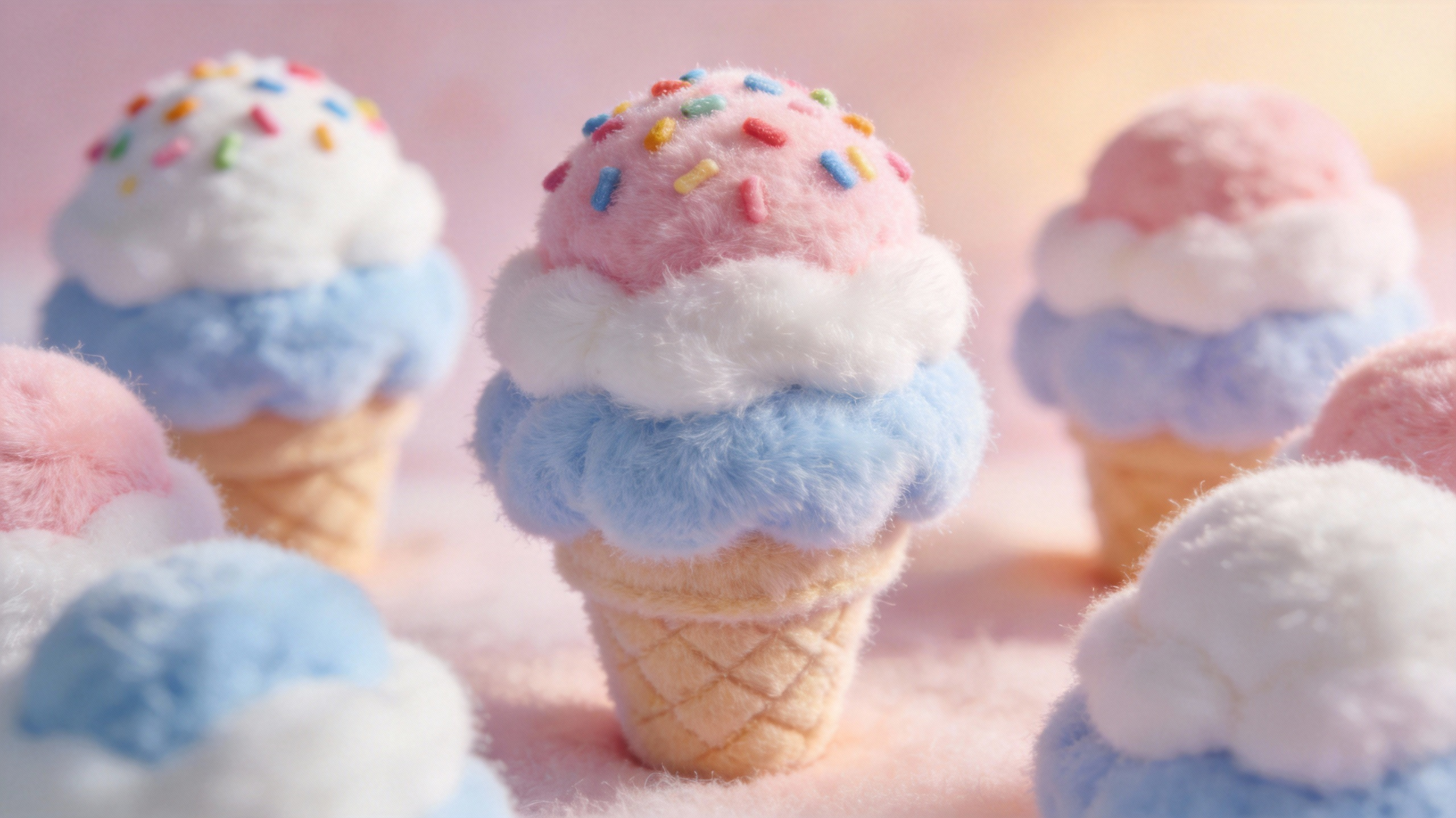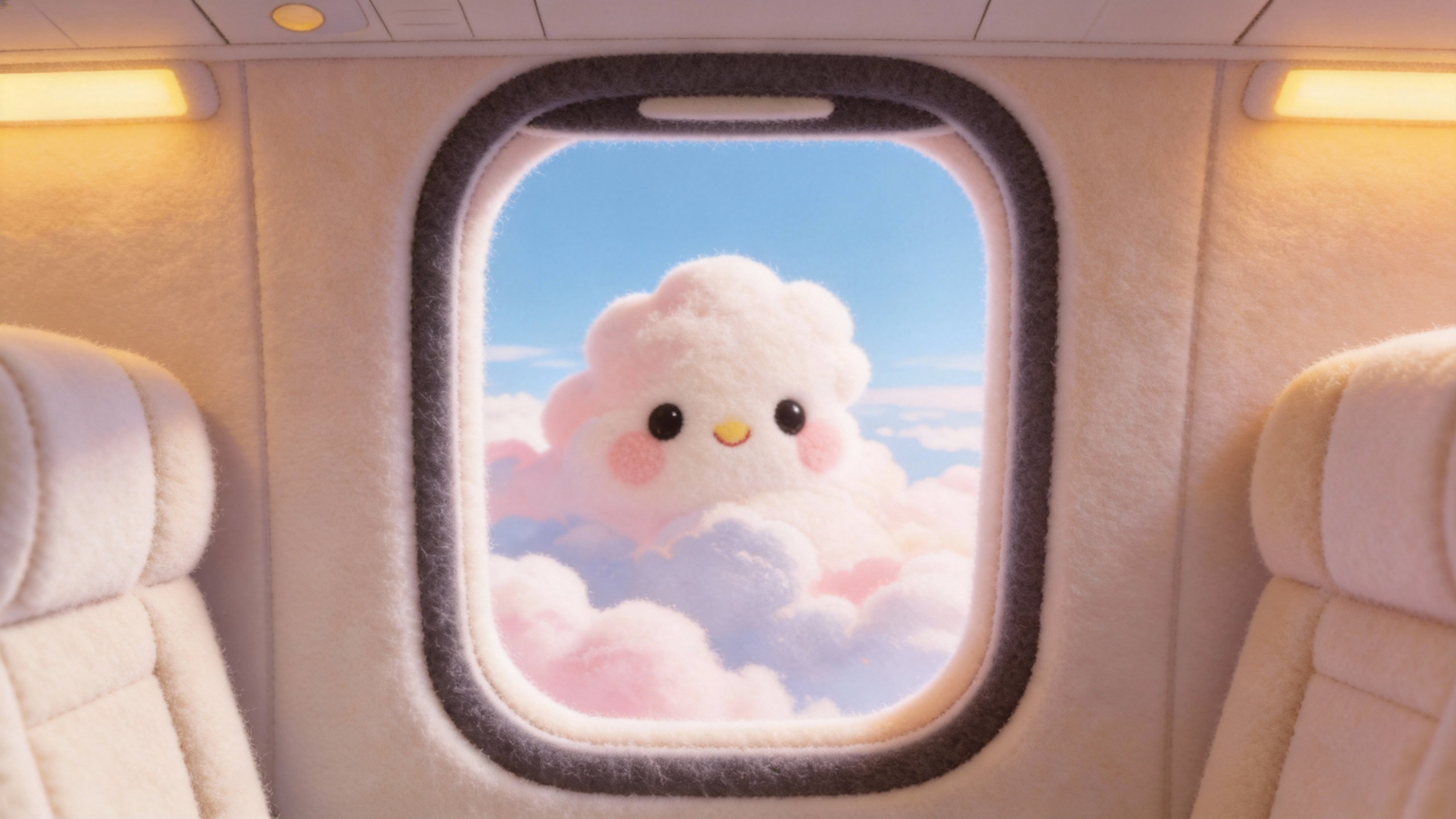 Use @Image1 as the first frame. Zoom in to outside the airplane window as clouds drift into view. One cloud, decorated with colorful candy sprinkles, stays centered in frame and slowly morphs into the ice cream in @Image2. The camera pulls back into the cabin; the person in @Image3 sitting by the window reaches outside to bring the ice cream in, takes a bite, gets cream on their lips, and smiles sweetly.