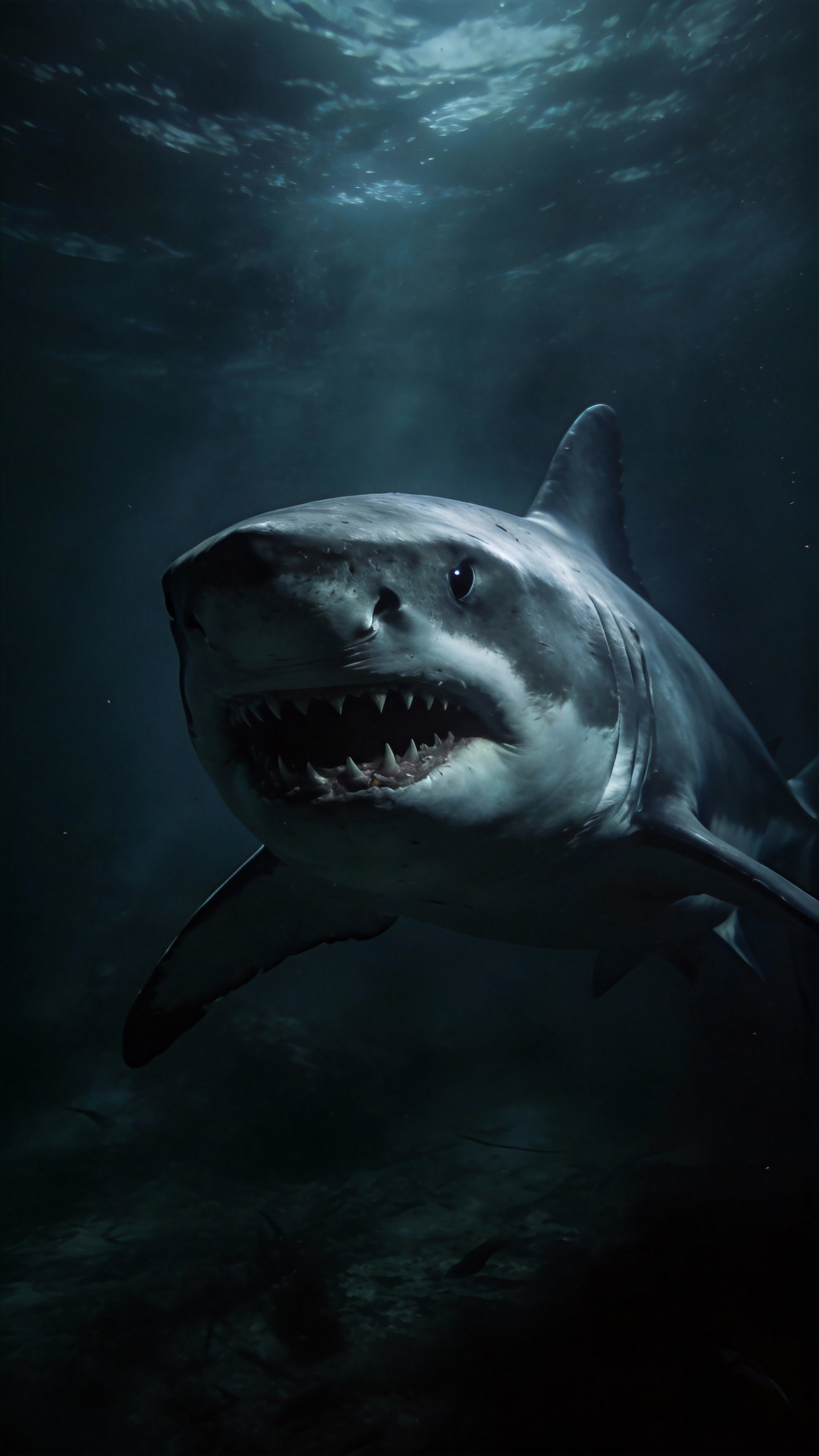 Change the woman's hairstyle in @Video1 to long red hair. The great white shark from @Image1 slowly rises behind her, revealing half its head.