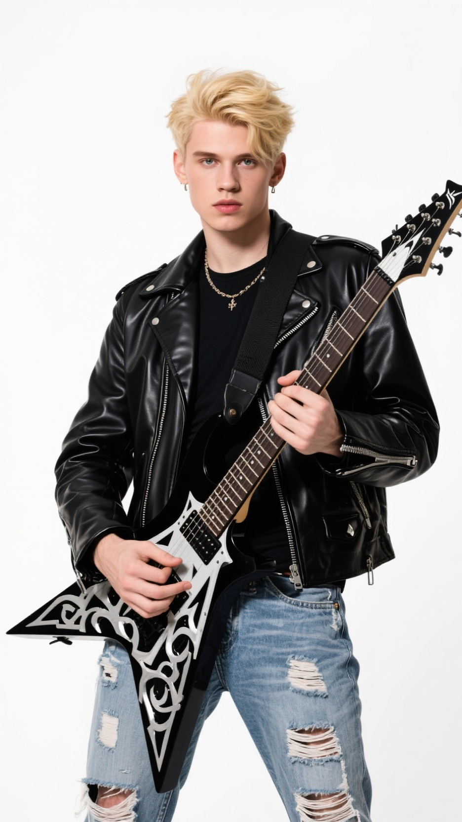 Replace the female lead singer in @Video1 with the male singer from @Image1. Fully mimic the original performance actions. No cuts—keep it one continuous shot, with band performance audio.