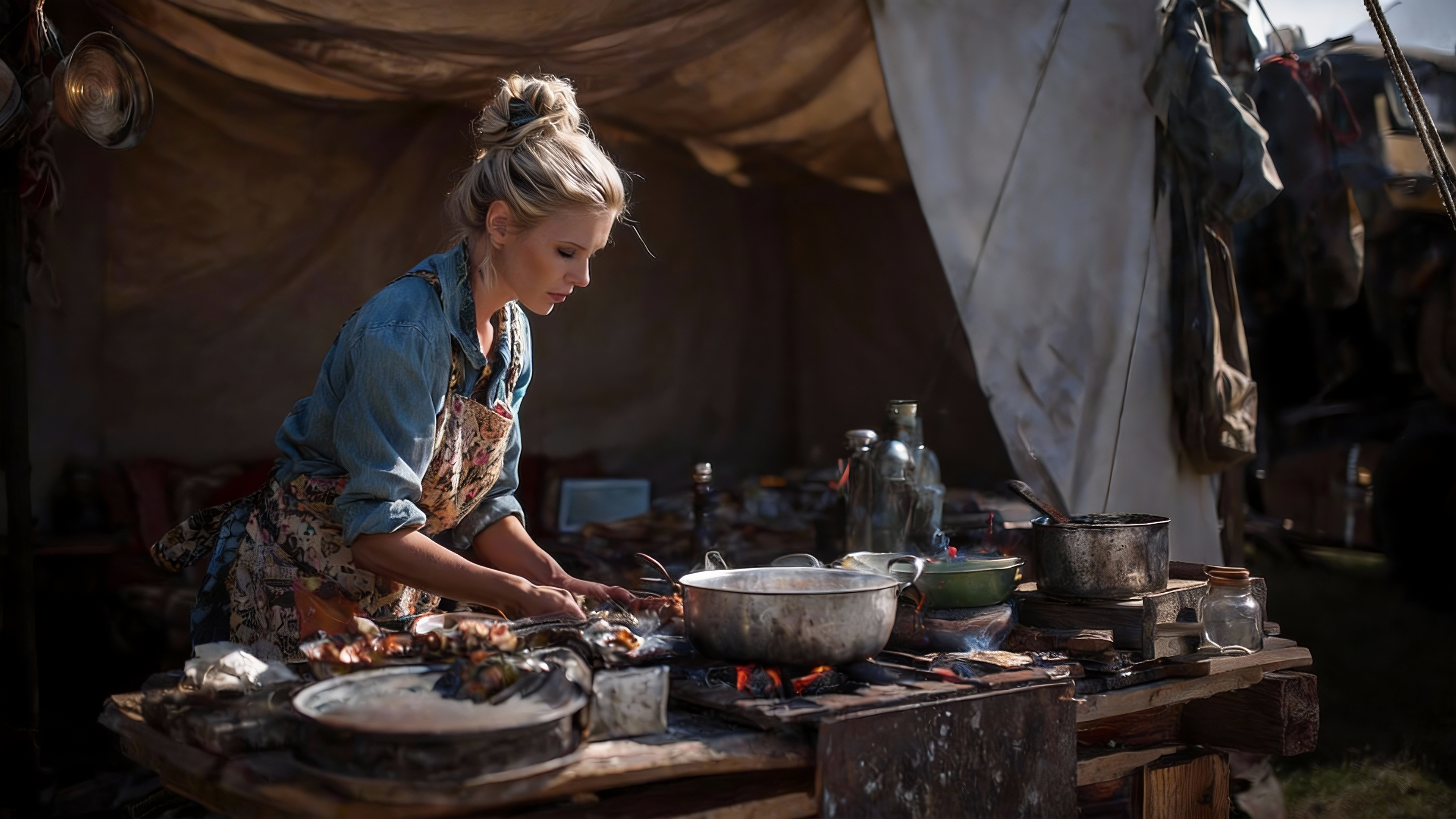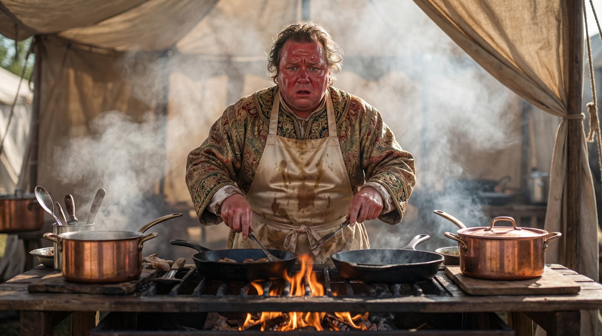 This is a kitchen range hood commercial. Use @Image1 as the first frame: the woman cooks elegantly with no smoke. The camera quickly pans right to the man in @Image2, sweating and red-faced while cooking amid thick smoke. Then pan left and push in to a range hood on the counter in @Image1; reference @Image3 for the hood, which is powerfully sucking up the smoke.
