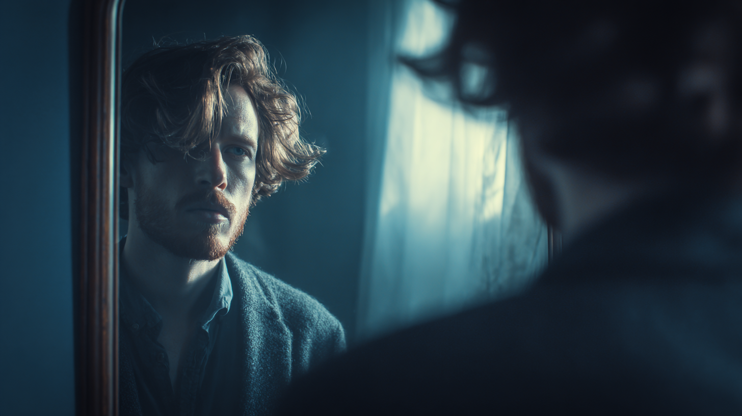 The woman in @Image1 walks up to a mirror and looks at her reflection. Reference the pose in @Image2. She thinks for a moment, then suddenly breaks down and screams. The action of grabbing the mirror, and the emotional breakdown facial expression, should fully reference @Video1.