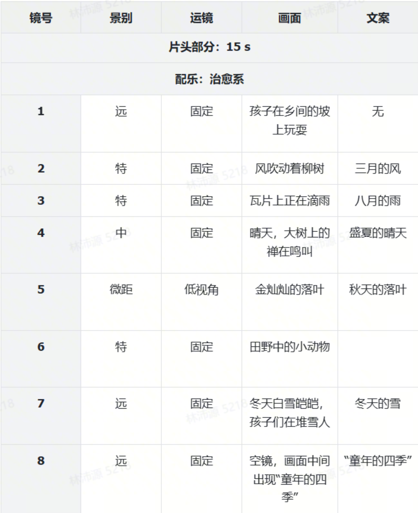 Reference the documentary-style storyboard in @Image1—its shot breakdown, framing, camera moves, visuals, and copy—to create a 15-second healing-style opening about the Four Seasons of Childhood.